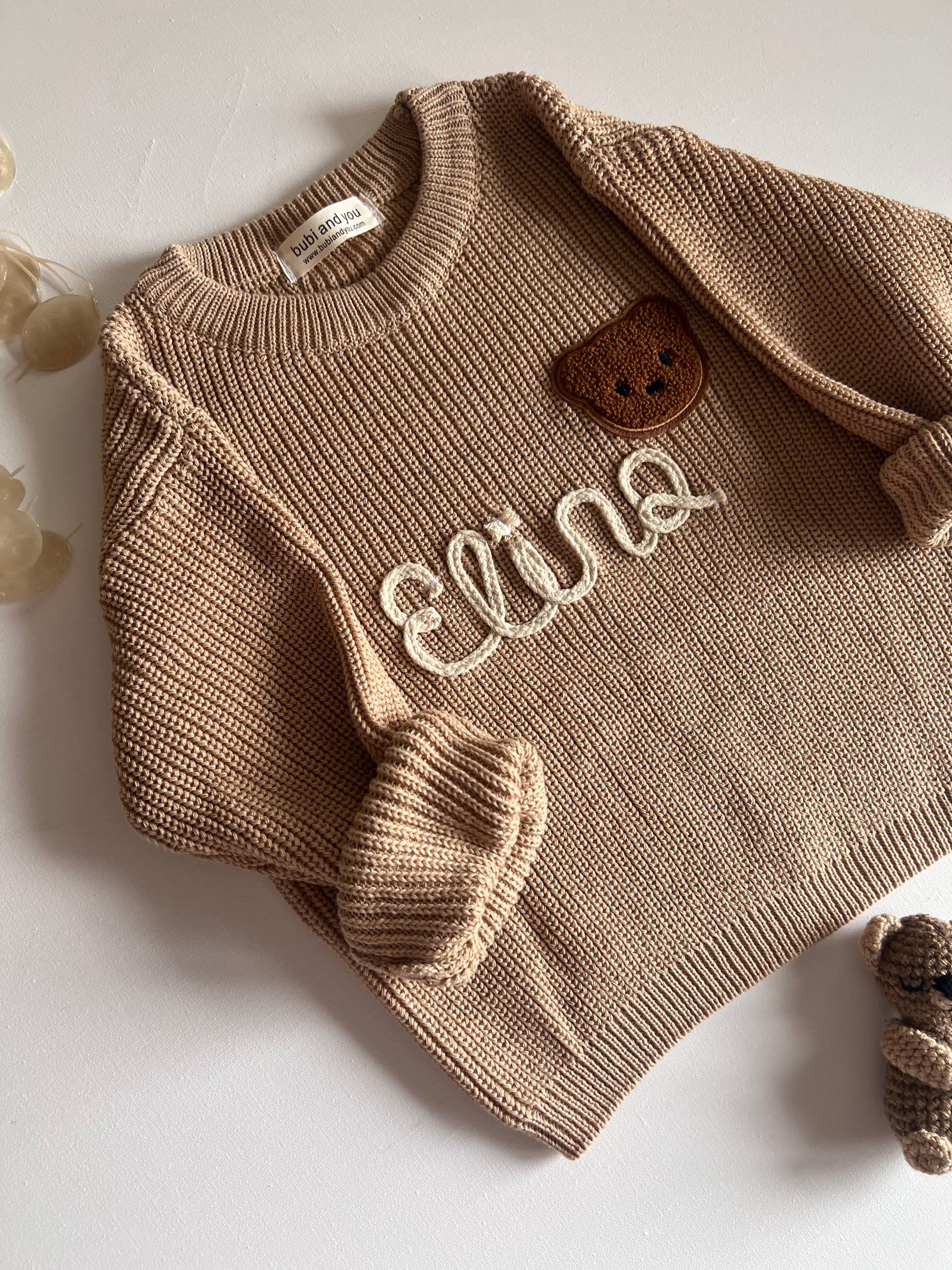 - This personalized baby and children's knitted sweater is the perfect gift for a birth, birthday or christening. Remember special moments with this individually embroidered name sweater made from 100% cotton. With the oversize cut and roll-up sleeves, it is not only comfortable but can also be worn for a long time